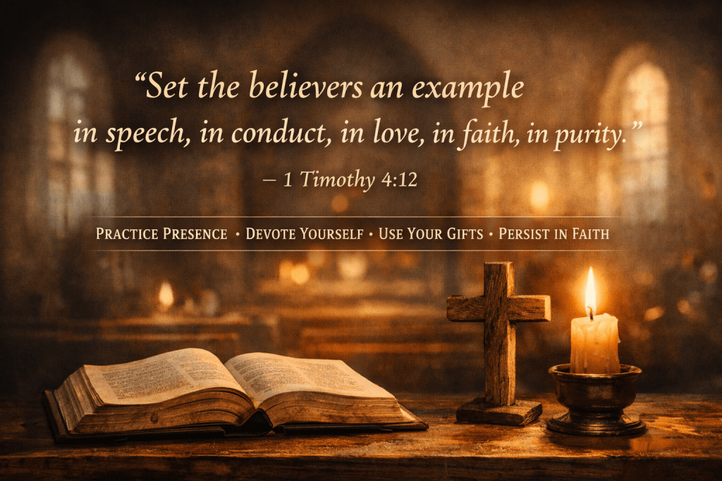 Paul’s instruction hinges on embodiment: speech, conduct, love, faith, and purity. In other words: who you are matters as much as what you say.